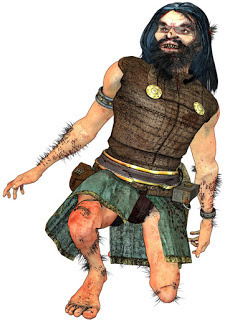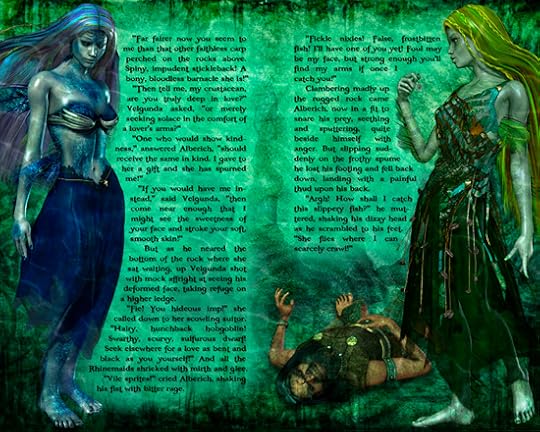 I did the usual dozen multipass renders at a pretty high resolution (3375x2000) to achieve as much detail as possible. The high resolution images I have posted up on the Fantasy Castle Books site are somewhat smaller than that (2000x1600 for the virgin art and 1280x1026 for the text layout), but large enough so you can see good detail. In print, of course, it will only be a 6x9" page, or 9x12" for the full layout, and smaller than that for the ebook, depending on your reader (although you'll be able to zoom in). But here for the first time you can really fully see the texture in the fishscale skin (and Flosshilda's is my favorite of the three), as well as the dirt and grunge on Alberich's clothes and skin. You can also clearly see the Viking torc he wears, and the ring on Flosshilda's finger.