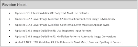 Amazon has recently issued a revised edition of the Kindle Publishing Guidelines, bringing it to Version 2014.2. Although the changes are few, some are fairly significant, so I thought I'd post a quick rundown here.