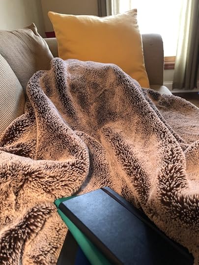 My couch getting its hygge on. Fuzzy blanket, journal, pillows. Check, check, check.