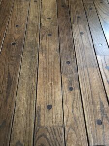 The floor is scratched and has some faded spots and minor damage. It has an odd design with dime-sized inserts in every board, making it appear sort of polka-dotted. There’s a faded spot in the middle which might have happened when we spilled something on the carpet. Still, its rustic beauty far outshines that ugly carpet. And it was under my feet all along.