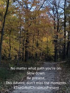 Choose your yes and no thoughtfully. We’re conditioned to say “yes” because we think it’s nicer or more generous or maybe more “Christian.” But here’s the thing: every yes is a no. When you say yes to doing one thing, you’ve automatically said no to any number of other things. So yes is not “nicer” or “better”–it’s simply a choice to say no to other things. Be honest with yourself about your capabilities and say yes to the things that bring you joy. Let other things go. Take your time, slow down before you say yes. By saying no to things that are non-essential, you’re free to say yes to what matters.Consider giving “experiences” rather than gifts. My kids have told me that they’d rather have me fund an experience than buy them more stuff. Who else might agree with that idea? Do any of us really need another sweater or Christmas candle? One of our gifts to our daughter and son-in-law was taking them to a professional football game. We made memories and had a great time.Take time for self-care. The first step to that? Slow down. The holiday season can be stressful. What are you doing to take care of yourself? Are you getting adequate rest? Can I suggest: taking just a few minutes a day to focus on things that really matter? And a great tool for that: my free ebook, The Gift of Christmas Present. Below you’ll find an excerpt to give you a taste of what’s in this little book.
