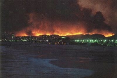 Photo of 1978 fire taken from Venice by Jeffery StantonAs a young man, my father fought to save his home from the Malibu fire of 1956. Though Dad was not a small man—standing 6’3” with a trim, athletic build from years of swimming and surfing—he nevertheless felt small and weak as the flames roared above his head on their way toward his house. The intense heat and deafening roar left a scar on his soul he would not soon forget. It was as if the flames were taunting his seemingly futile efforts to stop them. During the Mandeville Canyon fire, in 1978, I remember standing side by side with my dad, hosing down the roof of our house instead of celebrating my water polo victory. Our home barely escaped the destruction.After the fire was out, I went for a hike through the hills above our neighborhood and felt like I was in another world. For miles in every direction, all I could see was scorched, black earth, with the charcoal skeletons of dead trees reaching up in petrified agony. Not a single green leaf, blade of grass, or smallest of insect could be found. And not a solitary bird ventured over this wasteland. It was like being on the moon.
