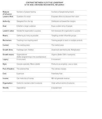 A few things are obvious. You cannot lead the way you have always done so in the past and expect different results. What brought success in the old form of influence will actually bring failure in the new. Drawing a crowd and dispersing a people movement are exactly the opposite sort of task. You can suck water in a straw or you can blow air out, but you can't do both at the same time. You cannot continue pursuing what once made you a success in the old way of influence and expect to be successful in the new.