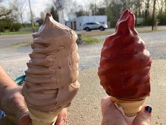 While I’m always partial to the turtle sundae with extra hot fudge and pecans, for the purposes of Metro-East Eats I opted for their newest experiment: the Cherry Bomb, a twisted ice cream cone dipped in chocolate shell and then in cherry shell.