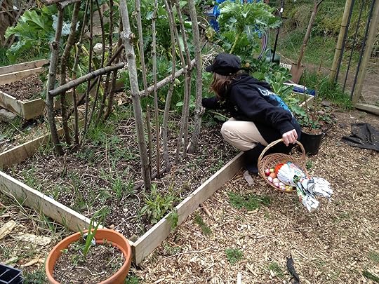 Back in my farm and gardening days, I made good use of my coppiced/pollarded bounty to build gates, trellises, structures for supporting beans, peas, cucumbers… Here, my niece is on an Easter egg hunt, oblivious to the magic of coppiced sticks to her left…