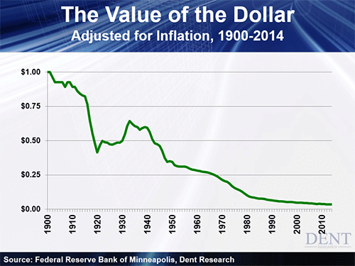 Looks bad, doesn’t it? Our All-American dollar has gone down 97%!