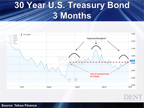 Note the head and shoulders pattern above. This pattern suggests long-term Treasury bond rates should drop down at least back to the 2.70% level, and possibly much lower.