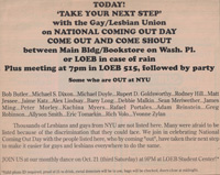 NY Dispatch 10/11/2020: Today is National Coming Out Day (NCOD), which is a LGBTQ+ day of visibility and awareness. Many of us use this day to come out of the closet and open up about our sexuality. I celebrated my first Coming Out Day as a freshman in college. I had joined NYU’s gay and lesbian student group and added my name to the ad they placed in the school paper to build awareness (and promote a school dance). I clipped this out and sent it to my mother with a note of explanation about...