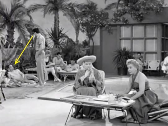 --The show was so popular that they got Rock Hudson to appear as himself in one episode. The audience clearly didn't know he was coming--you can hear the gasps of surprise when he strolls onstage. And here, your sharp-eyed reviewer caught something. We all know today that Hudson was gay, and the studio guarded this fact strictly back then. Can't have your #1 box office draw and sex symbol be a poof! But when Hudson appears on LUCY in a scene with a swimming pool, he strolls past a group of sunbathers. As he passes by, in what seems to be a bit of improv, he stops and strikes up a brief conversation with a Handsome Shirtless Man, completely ignoring the Lovely Bathing Beauty sitting right next to him. The studio must have had a whole litter of conniption kittens! See for yourself: