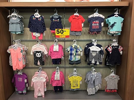 First, notice the color scheme. Pinks is absolutely required for girls, Only one outfit has no pink on it. For boys, it's blue. Every single outfit has blue on it somewhere. For boys, we also have dinosaurs, tools, a puppy, and a fire engine. Active, power imagines. To top it off, one of the shirts says, "Mommy's rescue hero," casting an TODDLER in the role of rescuer for his mother. (And why isn't that on the girls' side, pray?)
