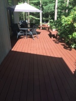 The deck needed to be restained yet again. We only did this two years ago, but it needed it again. Darwin is in charge of all outdoor projects, and I kicked him in the head reminded him repeatedly of this fact until he called a local business to come and do it.