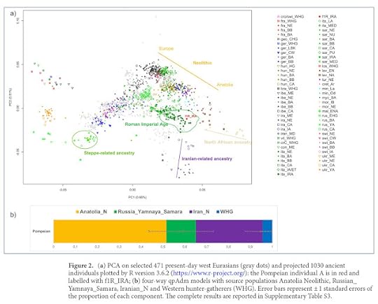 However, as far as the autosomal DNA results go, the paper states that the “genome-wide analyses point out that the Pompeian individual A is genetically close to the extant Mediterranean peoples, mostly to Central Italians and Sardinians.