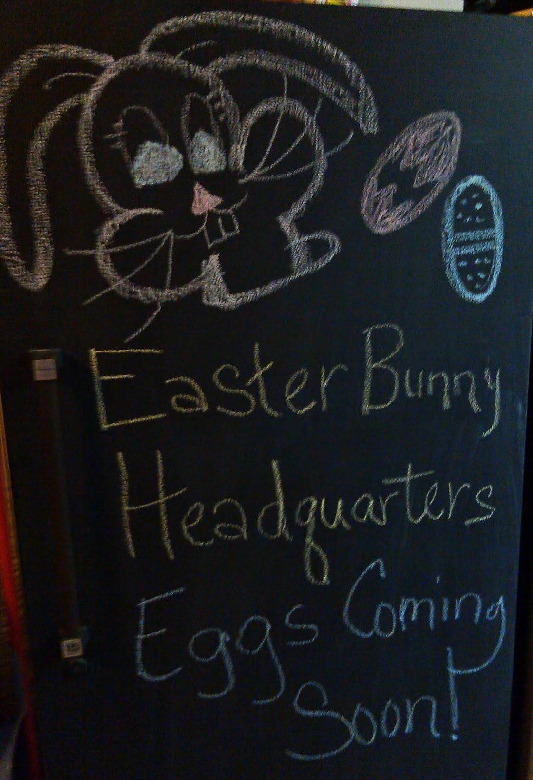 We love Easter. Celebrating the resurrection, the hope and love, and of course, that crazy bunny. He makes a great show at Grandma and Grandpa’s house every year. The girls are still amazed that he’d climbed way out on a tree branch a couple of years ago to hang up their tree swing. Last year he included a scavenger hunt with special eggs and prizes—and he’s busy trying to come up with something unique again this year. He also has to make a trip to the store to buy all the treats and tiny gifts to fill the 400+ eggs in the upstairs closet. The long term forecast looks like rain on Sunday, so the egg hunt will be in Grandpa’s shop again, which, in truth is easier—all can be done the night before. As you can see from the picture, painting the front of the freezer door with chalk board paint has been a hit. It has turned into a message board the kids rush to see what is on it every time they visit—and then create a message of their own before they leave.