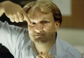 Image: Jim Christy points to the photographic plate on which he discovered Pluto’s largest moon, Charon, in 1978. Credit: U.S. Naval Observatory.