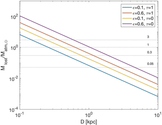 Image: This is Figure 1 from the paper. Caption: The total mass lost at the end of the AGN phase of Sgr A* by a terrestrial planet at distance D from the galactic center, in units of the atmosphere mass of present day Earth. Each curve was computed assuming a value for the efficiency of hydrodynamic escape of either ε = 0.1 or ε = 0.6. An optical depth τ = 1 corresponds to locations close to the galactic plane (maximum attenuation by the AGN torus) while τ = 0 corresponds to high galactic latitudes (no attenuation). Credit: Amedeo and Tombesi.