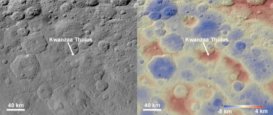 Image: Scientists say Kwanzaa Tholus may have once been as prominent as Ahuna Mons, the tallest and most noticeable mountain on Ceres. Ahuna Mons is likely a cryovolcano, a volcano formed by the gradual accumulation of thick, slowly flowing icy materials. Because ice is not strong enough to preserve an elevated structure for extended periods, cryovolcanoes on Ceres are expected to gradually collapse over tens of millions of years. This means Kwanzaa Tholus and other tholi in that area could be degraded mountains, which also formed from cryovolcanic activity. Credit: NASA/JPL-Caltech/UCLA/MPS/DLR/IDA.