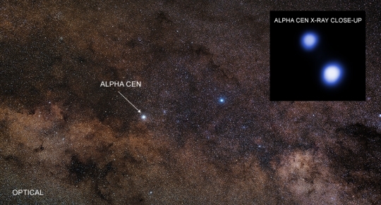 Image: A new study involving long-term monitoring of Alpha Centauri by NASA’s Chandra X-ray Observatory indicates that any planets orbiting the two brightest stars are likely not being pummeled by large amounts of X-ray radiation from their host stars. This is important for the viability of life in the nearest star system outside the Solar System. Chandra data from May 2nd, 2017 are seen in the pull-out, which is shown in context of a visible-light image taken from the ground of the Alpha Centauri system and its surroundings. Credit: X-ray: NASA/CXC/University of Colorado/T.Ayres; Optical: Zdeněk Bardon/ESO.