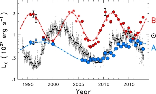 Image: Figure 1 from the Ayres note. Caption: X-ray light curves of a Cen AB and the Sun 1995–2018. Credit: T. R. Ayres.