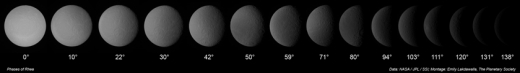 Image: The phases of Rhea. Emily Lakdawalla used these Cassini images to explain phase angle in a useful 2009 backgrounder. Her caption: The angle from the Sun, to a moon, to the observer is called “phase angle.” This montage shows Saturn’s moon Rhea as seen by Cassini through a clear filter at a variety of phase angles. The images have been resized to a constant pixel scale and rotated so that the terminator is up-and-down; the images sample a variety of latitudes and longitudes. Credit: NASA / JPL / SSI / montage by Emily Lakdawalla.