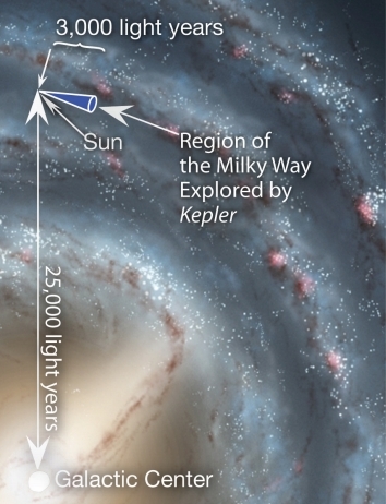 Image: The Sun is about 25,000 light years from the center of the galaxy, about half the distance from the center to the edge. The blue cone shows the region of the Milky Way that Kepler explored for planets. Kepler looked along a spiral arm of our galaxy. The distance to most of the stars for which Earth-size planets can be detected by Kepler is from 600 to 3,000 light years. Less than 1% of these stars in the region are closer than 600 light years. Stars farther than 3,000 light years are too faint for Kepler to observe the transits needed to detect Earth-size planets. Credit: NASA/JPL-Caltech/R. Hurt (SSC).