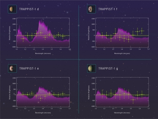 Pay particular attention to the purple curves in the above image. These show the signature we would expect to see from gases like water and methane, which would be found if any of these planets had a hydrogen-dominated atmosphere like Neptune’s. The spectroscopic signature should be strong in the near-infrared. The Hubble results are indicated by the green crosses, clearly showing no evidence of such an extended atmosphere for TRAPPIST-1 d, f and e.