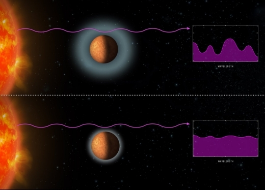 Image: The graphic at the top shows a model spectrum containing the signatures of gases that the astronomers would expect to see if the exoplanets’ atmospheres were puffy and dominated by primordial hydrogen from the distant worlds’ formation. The Hubble observations, however, revealed that the planets do not have hydrogen-dominated atmospheres. The flatter spectrum shown in the lower illustration indicates that Hubble did not spot any traces of water or methane, which are abundant in hydrogen-rich atmospheres. The researchers concluded that the atmospheres are composed of heavier elements residing at much lower altitudes than could be measured by the Hubble observations. Credit: NASA, ESA and Z. Levy (STScI).