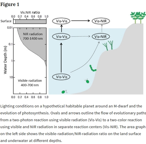 Thus it is possible that a ‘first wave’ of land plants could exhibit a red-edge position at 700–760 nm, as on the Earth. Using near-infrared radiation underwater would expose phototrophs to strong changes in light intensity and quality when they approach the water’s surface. That makes it more likely that adaptation to near-infrared would occur once on land, where the radiation spectral change is smaller.