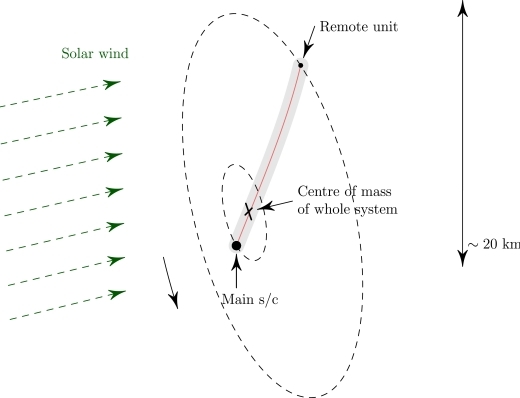 The tether makes a complete rotation every 50 minutes, creating a shallow cone around a center of mass close to the primary spacecraft. Each small craft can change its orientation to the solar wind, and thereby alter its thrust and direction. Janhunen’s presentation at the EPSC made the case that a 5 kg spacecraft with a 20 kilometer tether could accelerate at 1 millimeter per second squared at the Earth’s distance from the Sun. Coupled with the boost provided by the launch itself, this is enough to complete a tour through the asteroid belt and return within 3.2 years.
