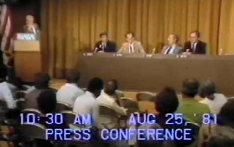 Voyager 1 encountered Saturn in November 1980 and Voyager 2 in August 1981. We do not have online any of the daily press conferences or full Voyager updates; we do have though two educational documentaries from the time that include extended footage from them. In both cases they are of Voyager 2’s encounter with Saturn. Why Voyager 1’s encounter is not shown is unknown to me, but my guess is that these videos where shown in the run up to the 1986 Voyager 2 encounter with Uranus, and thus the idea was to show what Voyager 2 did in its last encounter. Both videos come from collectors of archival documentary footage on YouTube.
