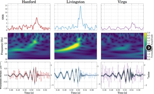 Image: Top row: Signal-to-noise ratio as a function of time. The peaks occur at different times in different detectors because gravitational waves propagate at the finite speed of light; this causes the signal to reach the detectors at different times. GW170814 arrived first in LIGO-Livingston, then 8 ms later in LIGO-Hanford and 6 ms after that in Virgo. Middle row: Time-frequency representation of the strain data. The brighter a given pixel in any of the three 2D-maps, the larger the signal at this particular time and frequency with respect to the expected noise level. Note the characteristic “chirp” pattern of increasing frequency with time. Bottom row: Strain time series with the best waveforms selected by the matched filtering (black solid curves) and unmodeled search methods (gray bands) superimposed. Credit and copyright: LIGO Scientific Collaboration and Virgo Collaboration.