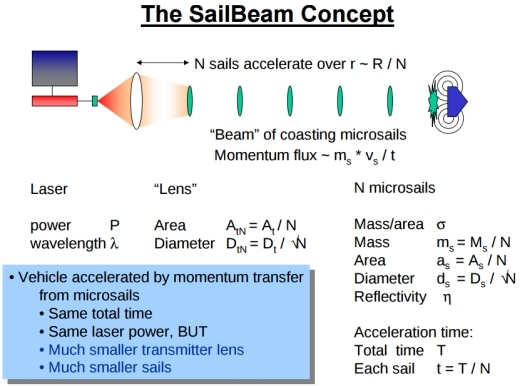 Along those lines, I had realized that there’s a scaling law to how laser sails worked. If you took a laser sail and tried to get to a certain velocity with a certain size laser and certain size sail, and then you took that sail and cut it into several pieces and accelerated those one after another, you could get the same amount of mass to the same velocity in the same amount of time, but you could use a smaller laser because the sail doesn’t accelerate over as long a distance.