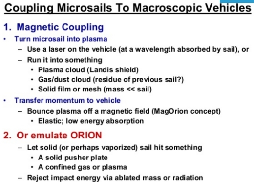 The gist of the idea is this: Kare’s tiny sails, made of diamond film and pushed by a multi-billion watt orbiting laser, could be accelerated much closer to their power source than Forward’s sails and brought up to a substantial fraction of lightspeed within seconds. Kare coupled sail concepts with Cliff Singer’s pellet propulsion, reasoning that his tiny sails could intercept a large interstellar probe and become a source of propulsion as they were vaporized into plasma.
