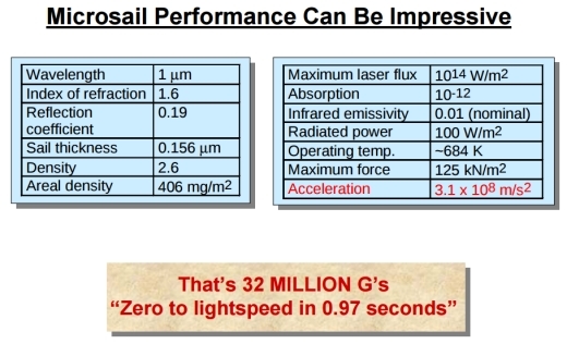 If a Sprite could be made thin enough, then its entire body could act as a solar sail. We calculate that at a thickness of about 20 micrometers—which is feasible with existing fabrication techniques—a 7.5-mg Sprite would have the right ratio of surface area to volume to accelerate at about 0.06 mm/s2, maybe 10 times as fast as IKAROS [the Japanese solar sail]. That should be enough for some interplanetary missions. If Sprites could be printed on even thinner material, they could accelerate to speeds that might even take them out of the solar system and on toward distant stars.
