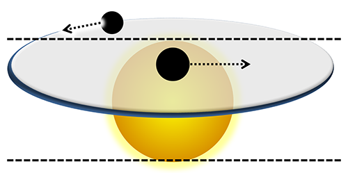 Image: A star with a transiting planet and its moon. The angled area shows the inclination of the moon orbit. Orbit positions beyond the dashed line are not undergoing transit, and are thus not observable. Credit: Michael Hippke.
