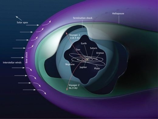 Image: The Voyagers outbound. A representation of the heliosphere, including the termination shock (TS), the heliopause and the interstellar medium where the heliosphere ends. Credit: Science, NASA/JPL-California Institute of Technology. Note: In this image, the locations of the Voyagers are updated only to September 2011, by Brad Baxley, JILA.