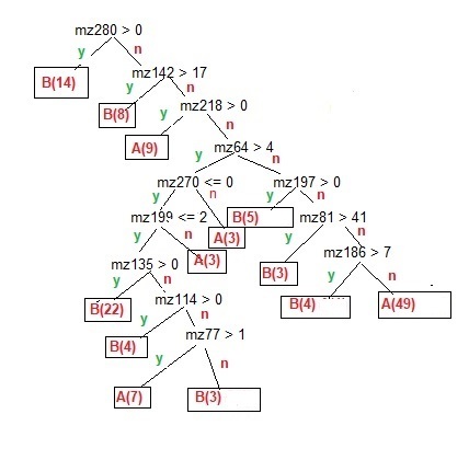 Figure 3. The model for a Decision Tree output for a reduced collapsed set of data. It shows the rule tree of different mass normalized frequencies to classify abiotic [A], and biotic and natural [B], samples as leaves. There are 134 samples, For training, all the samples were used, 75 are classed abiotic, and 59 and biotic/natural. [The few misclassified samples were excluded for simplicity and clarity]. As all samples were used, there was no out-of-sample testing of the model.
