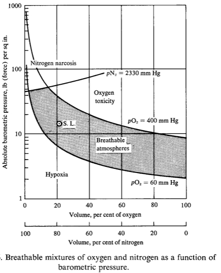 Image: Original illustration from Dole’s Report. You may notice the lower level of O2 set at 60 mm Hg. This is the blood level minimum not the atmospheric minimum. There is a 42 millibar drop in O2 partial pressure between the atm. and the blood.