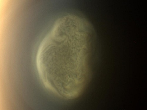Image: This true color image captured by NASA’S Cassini spacecraft before a distant flyby of Saturn’s moon Titan on June 27, 2012, shows a south polar vortex, or a mass of swirling gas around the pole in the atmosphere of the moon. The south pole of Titan (3,200 miles, or 5,150 kilometers, across) is near the center of the view. NASA/JPL-Caltech/Space Science Institute.