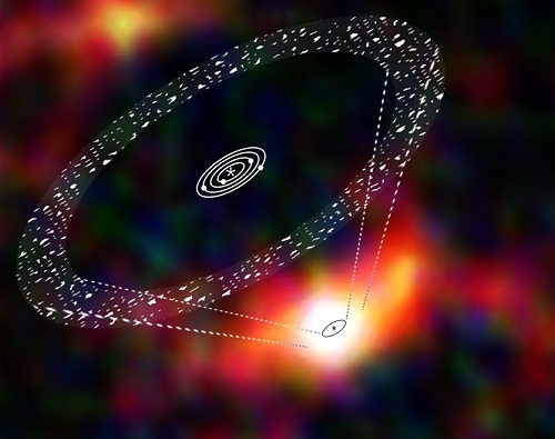 Image: An expanded diagram of the debris disc and planets around the star known as Gliese 581, superimposed on a composite Herschel image assembled from separate observations made with its PhotoArray Camera and Spectrometer (PACS) at 70, 100 and 160 micrometre wavelengths. The white region in the lower centre of the image is the emission that originates almost entirely from the disc, with only a small contribution from the unseen Gliese 581. The line drawing superimposed on the Herschel image gives a schematic representation of the location and orientation of the star, planets and disc, albeit not to scale. The black oval outline sketched onto the Herschel data represents the innermost boundary of the debris disc; the approximate location of the outermost boundary is represented by the outer set of dashed lines. Credit: ESA/AOES.