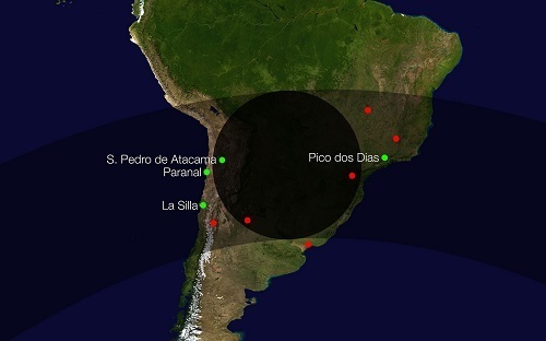 Image: This diagram shows the path of the shadow of the dwarf planet Makemake during an occultation of a faint star in April 2011. Several sites in South America, including ESO’s La Silla and Paranal Observatories, saw the star disappear briefly as its light was blocked by Makemake. This dwarf planet is about two thirds of the size of Pluto, and travels around the Sun in a distant path that lies beyond that of Pluto, but closer to the Sun than Eris, the most massive known dwarf planet in the Solar System. Makemake was expected to have an atmosphere like Pluto, but the new occultation data show that this is not the case. Credit: ESO/L. Calçada.