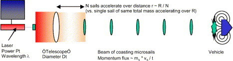 Later, Gerald Nordley would take the logical leap of ‘smart’ pellets, with enough technology aboard to adjust their course as required. Nordley’s ‘snowflake’ pellets would be built around nanotechnology and could find their own way to a starship that could itself make small changes in course if required to stay within the stream. And Jordin Kare subsequently produced ‘SailBeam,’ in which Singer’s pellets give way to tiny ‘micro-sails’ that can be accelerated to the departing starship and vaporized upon approach, becoming a plasma that drives the spacecraft.