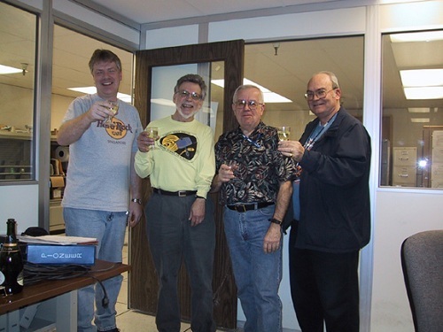 Image: For old times’ sake (and because these guys are heroes of mine), great figures from the Pioneer era, here seen celebrating after what turned out to be one of the last contacts with Pioneer 10 in 2002 (the final contact was made in January of 2003). Left to right: Paul Travis, Pioneer senior flight controller; Larry Lasher, Pioneer project manager; Dave Lozier, Pioneer flight director and Larry Kellogg, project flight technician. Credit: NASA Ames.