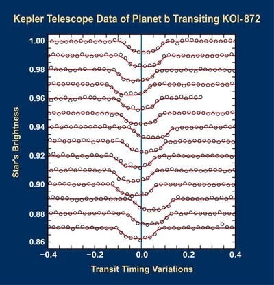 Image: Scientists analyzed Kepler Telescope data and identified KOI-872 as a stellar system where measured transits of a planet orbiting the star show large time variations (the shifting bumps in the data) indicative of a hidden companion. A team led by Southwest Research Institute and the Harvard-Smithsonian Center for Astrophysics determined that the observed variations can be best explained by an unseen planet about the mass of Saturn orbiting the host star every 57 days. Credit: Southwest Research Institute.