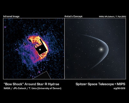 Image: Spitzer image and artists conception of the bow shock around R Hya. Credit: NASA/JPL, Toshiya Ueta.