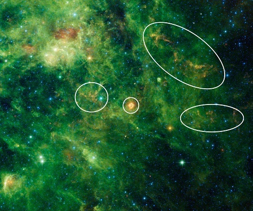 WISE is, of course, equally attuned to the study of distant objects, as in the image below, which shows the 'light echo' of the supernova event associated with Cassiopeia A, one of the most powerful radio sources in the sky. The light from the explosion reached the Earth around 1667 AD but seems to have gone unnoticed, probably because dust between the event and the Earth would have dimmed the explosion so as to make it all but invisible to the naked eye.