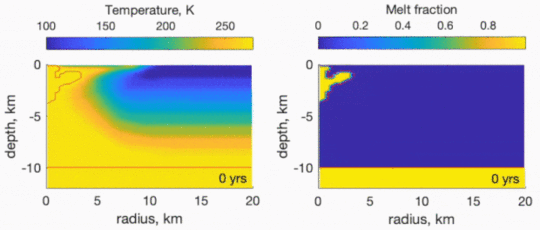 Image: A computer-generated simulation of the post-impact melt chamber of Manannan Crater, an impact crater on Europa. The simulation shows the melt water sinking to the ocean within several hundred years after impact. Credit: Carnahan et al.