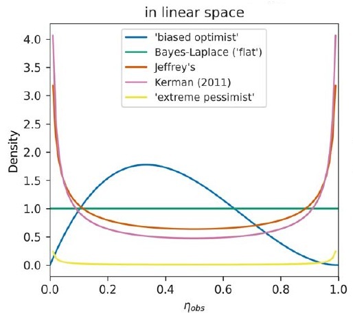 Figure 1. The five different prior distributions as probability density functions (PDF) used in the paper and explained in Box 2. Note the Kerman and Jeffreys distributions that bias the probabilities at the extremes, compared to the “biased optimist” that has 3 habitable worlds around the sun (Venus, Earth, and Mars), but with only the Earth having life.