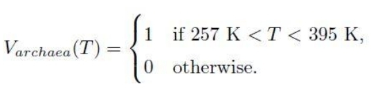 The equation means that the probability of viability of the archaea at temperature T in degrees Kelvin is 1 if the temperature is between 257 K ( -16 °C) and 395 K (122 °C). Otherwise 0 if the temperature is outside the viable range. (Ironically, this is imprecise, as it is for a species of archaean methanogen extremophile, not all archaeans.)