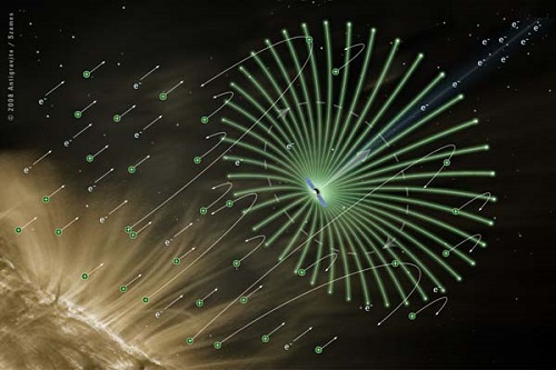 Image: Image of an electric sail, which consists of a number (50-100) of long (e.g., 20 km), thin (e.g., 25 microns) conducting tethers (wires). The spacecraft contains a solar-powered electron gun (typical power a few hundred watts) which is used to keep the spacecraft and the wires in a high (typically 20 kV) positive potential. The electric field of the wires extends a few tens of meters into the surrounding solar wind plasma. Therefore the solar wind ions “see” the wires as rather thick, about 100 m wide obstacles. A technical concept exists for deploying (opening) the wires in a relatively simple way and guiding or “flying” the resulting spacecraft electrically. Credit: Artwork by Alexandre Szames. Caption via Pekka Janhunen/Kumpula Space Center.