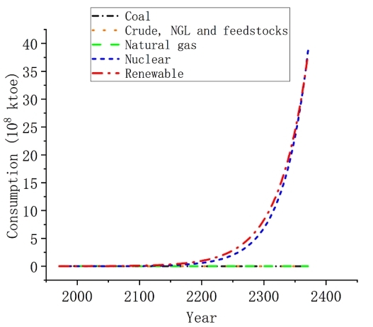 Image: Figure 6 from the paper. Caption: The energy supply in the influenced model. Note: Coal is minimal for 1971-2050 and largely coincides with the Natural gas line. Credit: Jiang et al.